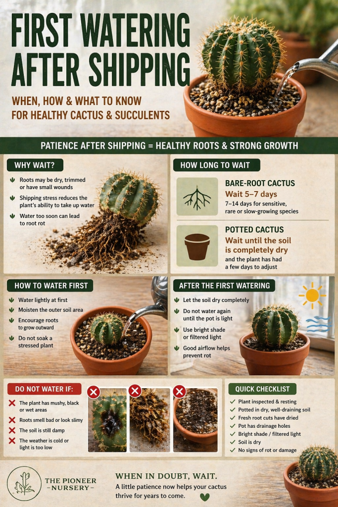 For cactus and many succulents, a short dry period after arrival is usually much safer than watering immediately.