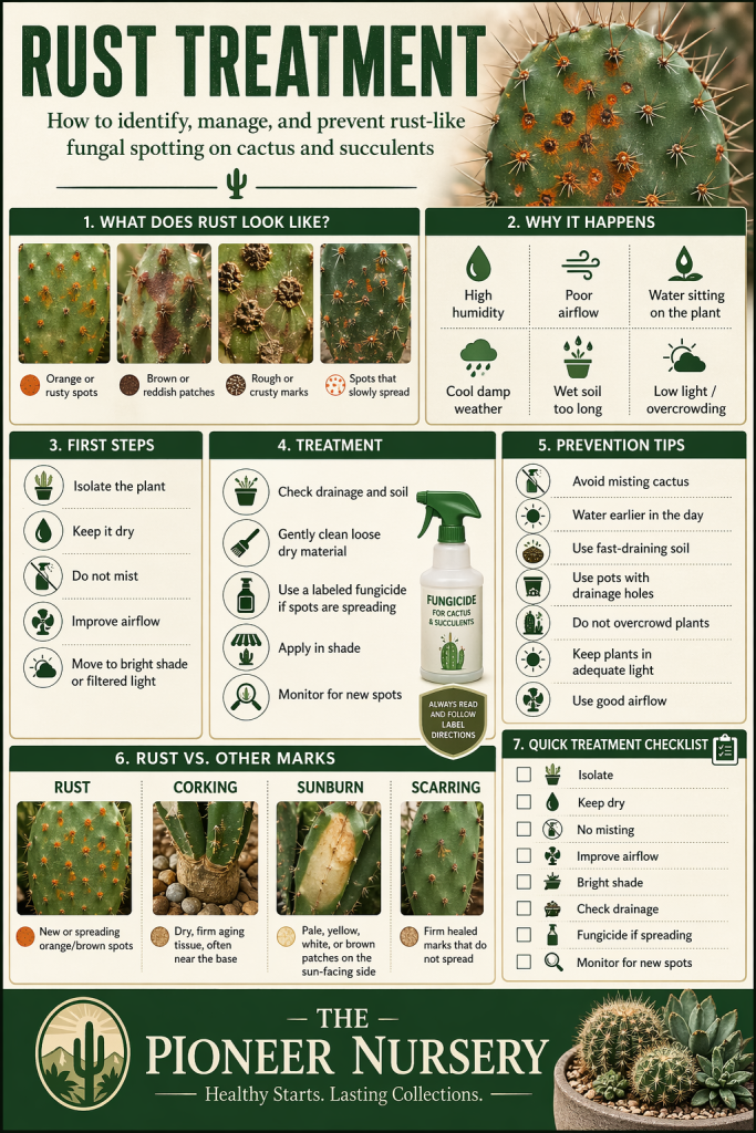 Rust and rust-like fungal problems are often encouraged by moisture and poor airflow. Cactus are more likely to develop surface fungal issues when they stay damp too long or sit in humid, stagnant conditions.