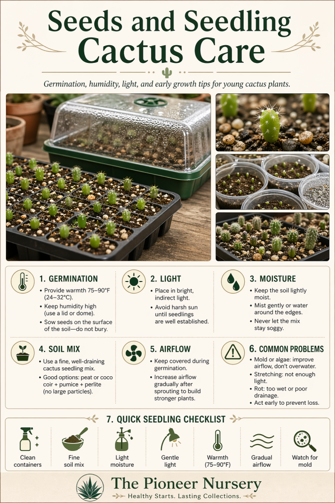 Growing cactus from seed takes patience, but it is one of the most exciting ways to build a collection. Seedlings may start tiny and fragile, but with stable moisture, gentle light, warmth, and gradual airflow, they can develop into strong young cactus.